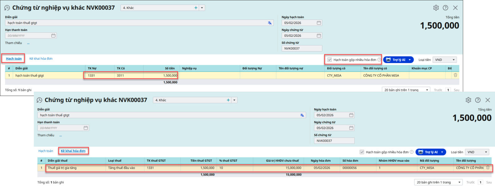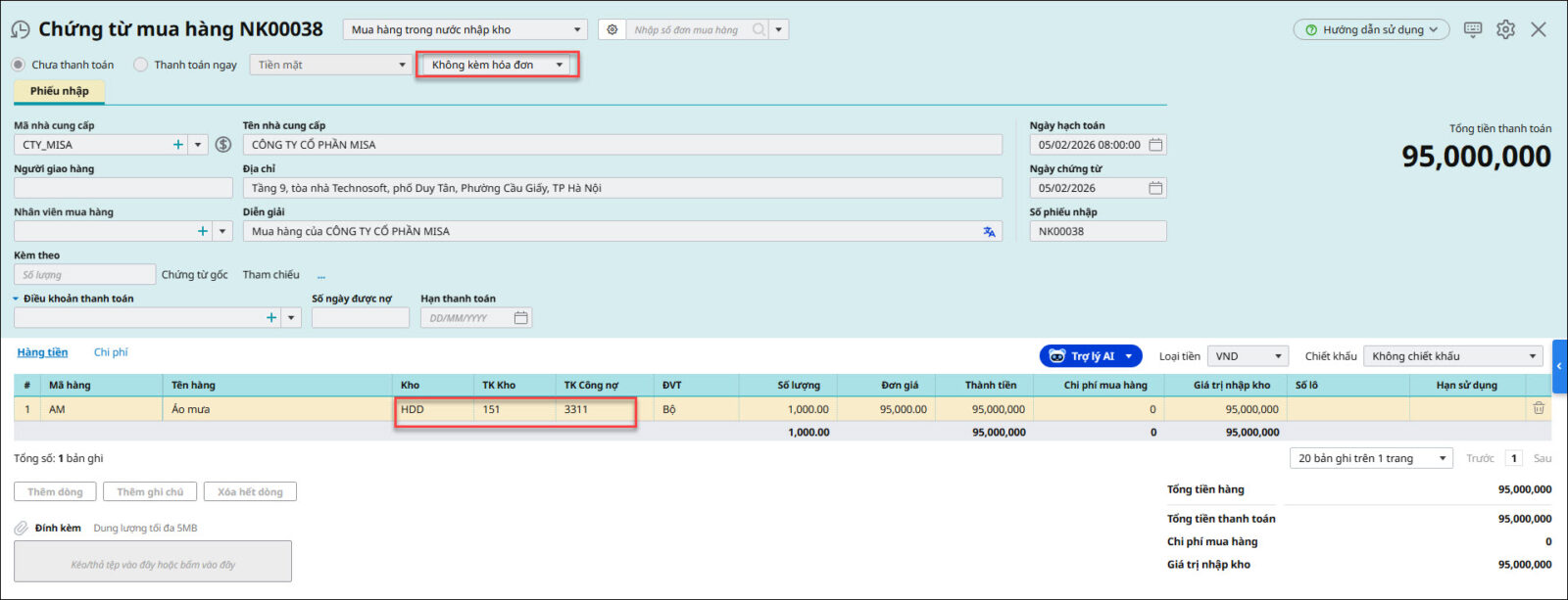 Bước 2: Hạch toán chứng từ mua hàng sau khi nhận hàng ở năm nay