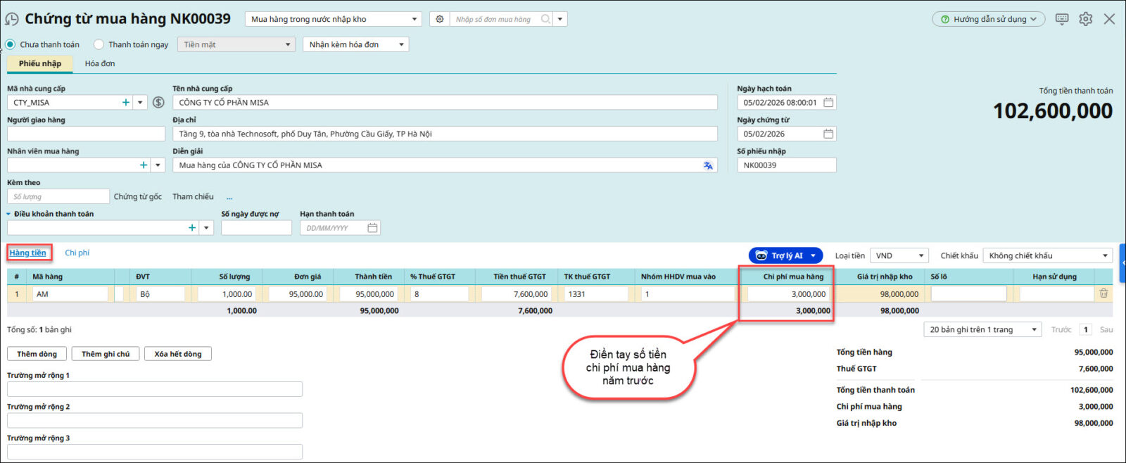 Cách 2: Hạch toán chi phí mua hàng ở dữ liệu năm trước. Ở dữ liệu năm nay lập Chứng từ mua hàng nhập kho kèm hóa đơn và tự gõ tay chi phí mua hàng vào cột Chi phí mua hàng trên chứng từ mua hàng