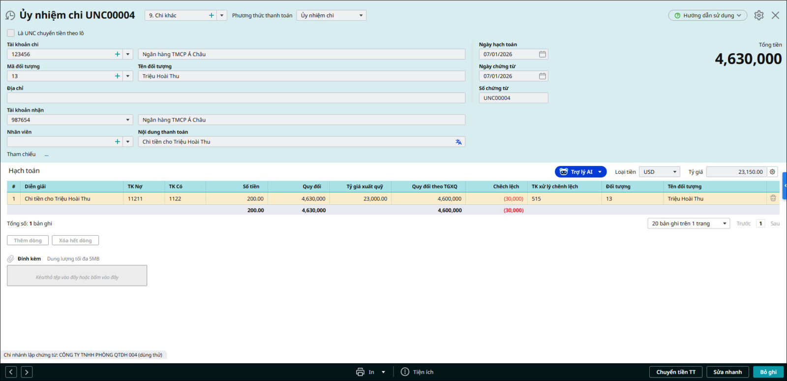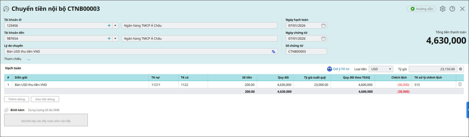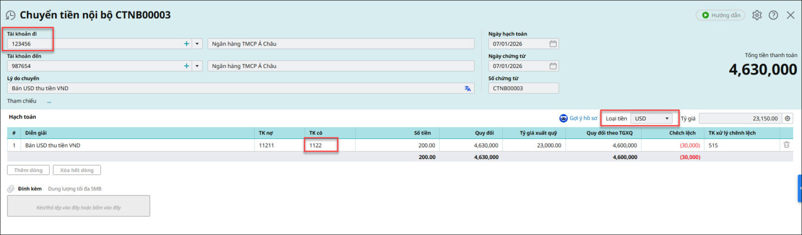Ví dụ: Đơn vị có 2 số tài khoản ngân hàng của ngân hàng ACB: TK USD là 123456, TK VND là 987654. Đơn vị phát sinh nghiệp vụ bán USD từ tài khoản 123456 để chuyển vào tài khoản VND.