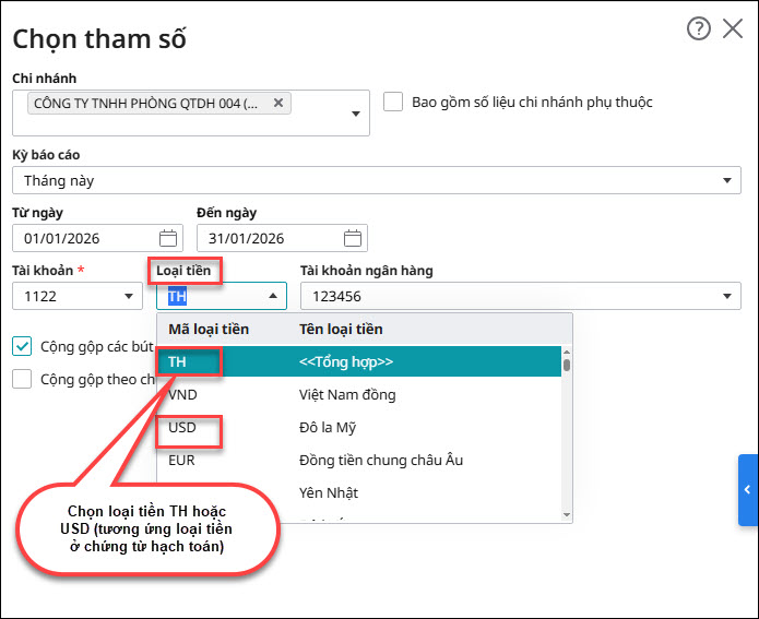 Cách xử lý: Anh chị chọn lại tham số Loại tiền khi mở báo cáo tiền gửi là TH – Tổng hợp hoặc loại tiền ngoại tệ tương ứng với loại tiền trên chứng từ hạch toán, sau đó kiểm tra lại báo cáo