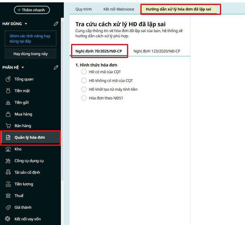 Bước 1: Vào phân hệ Quản lý hóa đơn \Hướng dẫn xử lý hóa đơn đã lập sai\ Chọn Nghị định 70/2025/NĐ-CP, chọn hình thức hóa đơn cần tra cứu cách xử lý sai sót.