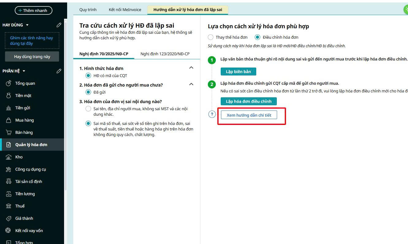 Bước 3: Chương trình hiển thị cách xử lý hóa đơn sai sót, nhấn Xem hướng dẫn chi tiết để xem chi tiết cách xử lý.