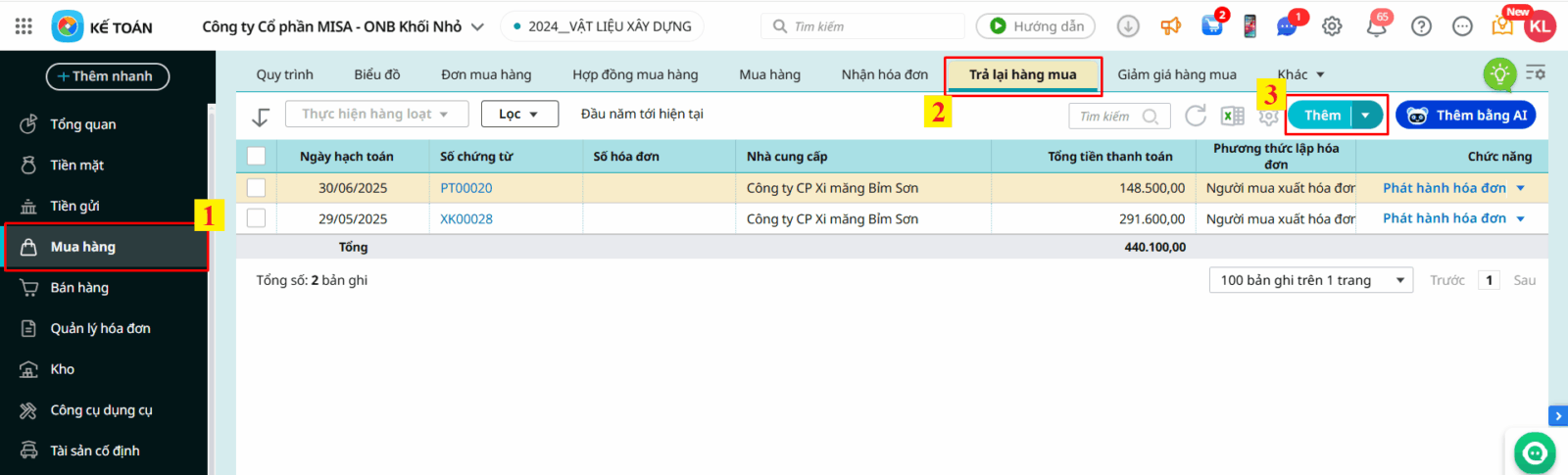 Bước 1: Vào phân hệ Mua hàng, tab Trả lại hàng mua, nhấn Thêm