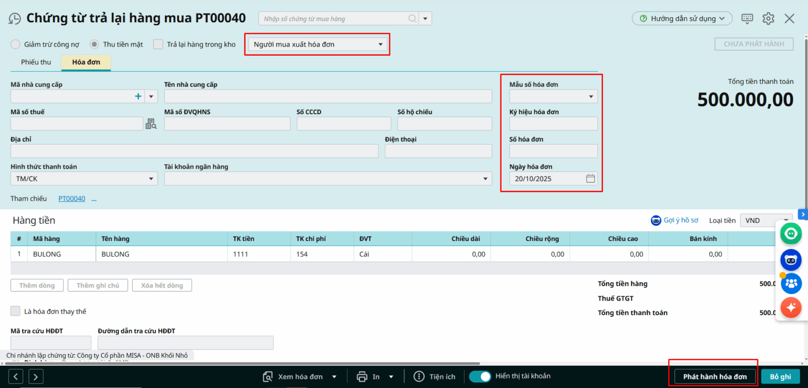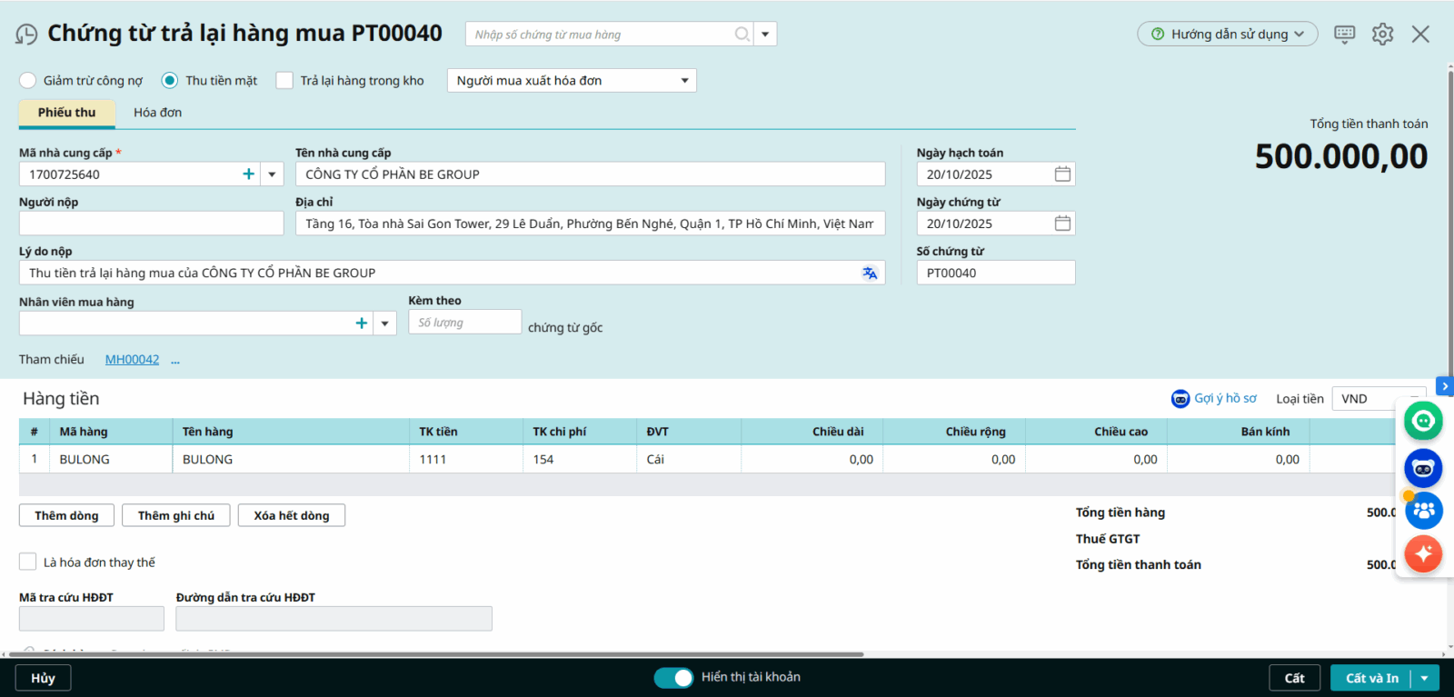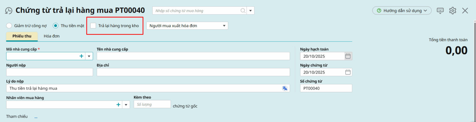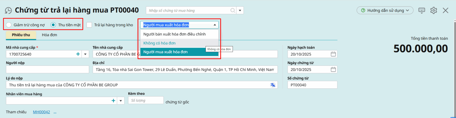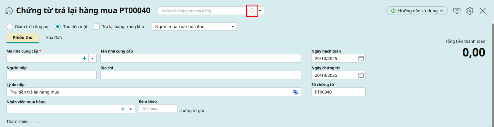 Bước 3: Hoàn thiện thông tin chứng từ Trả lại hàng mua