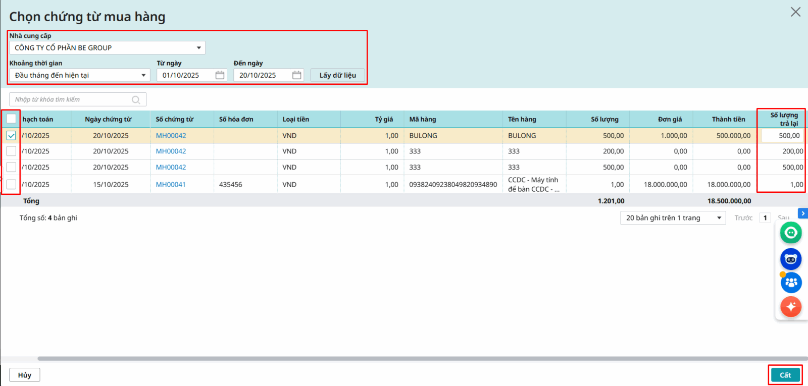 - Tích chọn các mặt hàng bị trả lại và nhập số lượng hàng bị trả lại.