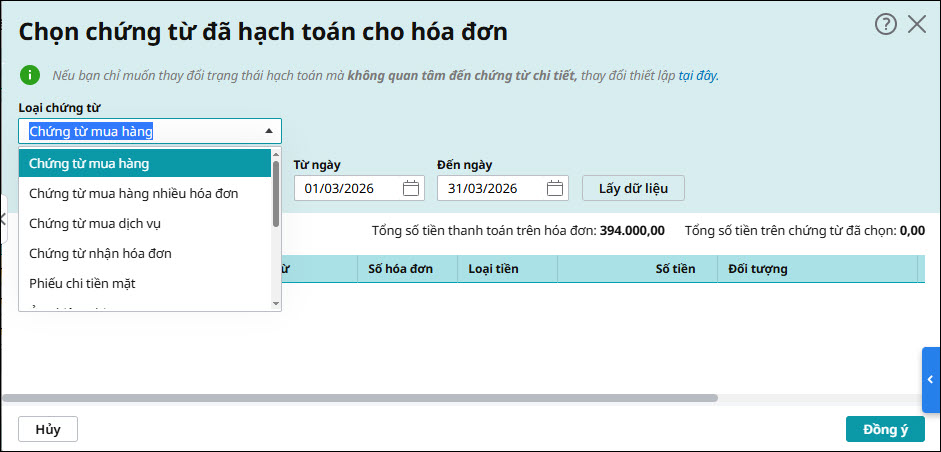 • Phải chọn chứng từ chi tiết: Khi đánh dấu hóa đơn đã hạch toán, người dùng bắt buộc phải chọn chứng từ đã lập (ví dụ: chứng từ mua hàng, chứng từ chi tiền, chứng từ khác liên quan) để liên kết với hóa đơn. Tùy chọn này giúp theo dõi chính xác hóa đơn đã được hạch toán theo chứng từ nào.