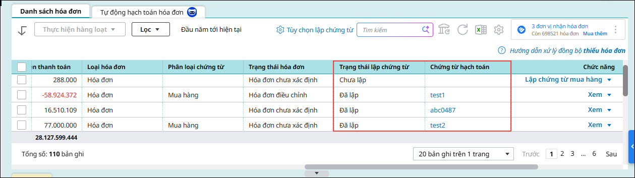 Bước 3: Kiểm tra trạng thái lập chứng từ và chứng từ thanh toán tại danh sách hóa đơn đầu vào:
