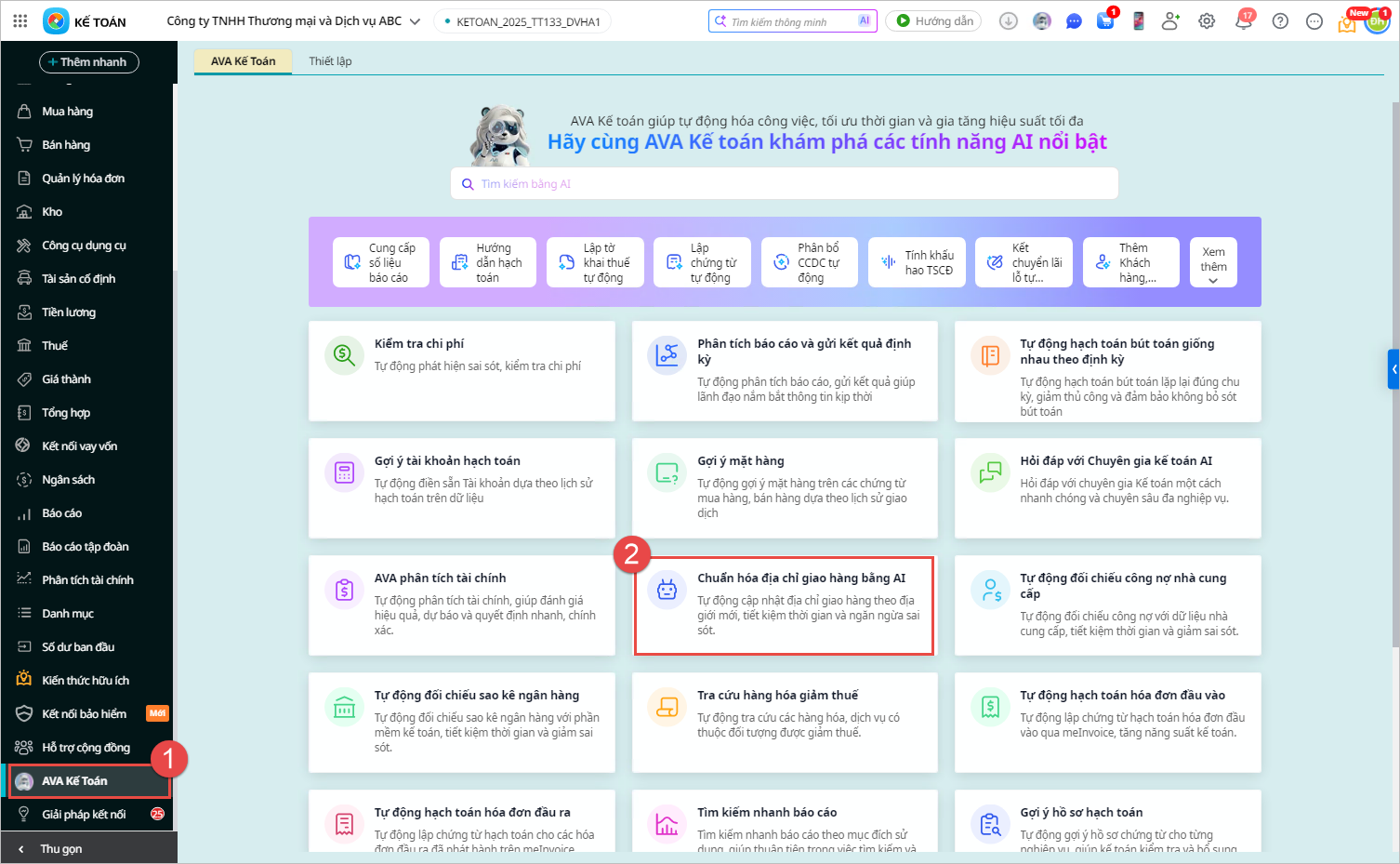 - Tại phân hệ AVA Kế toán tab AVA Kế toán, nhấn vào chức năng Chuẩn hóa địa chỉ giao hàng bằng AI: