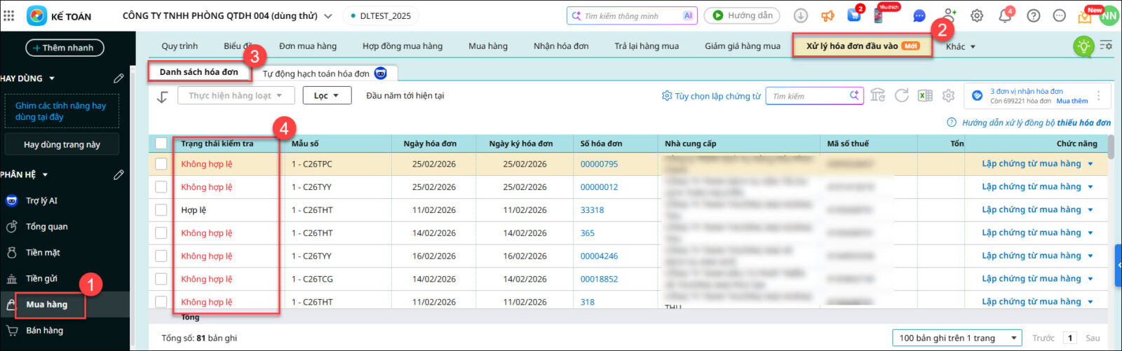 2.3. Tự động kiểm tra hóa đơnChương trình sẽ thực hiện kiểm tra hóa đơn và xác định các danh mục Nhà cung cấp/VTHH mới phát sinh và tự động thêm mới các danh mục này trên dữ liệu kế toán.