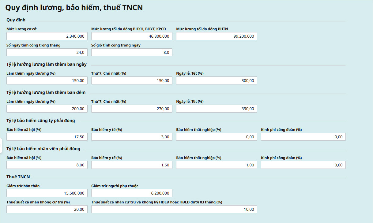 Bài viết hướng dẫn ý nghĩa và chức năng của tính năng trong mục mục Quy định lương, bảo hiểm, thuế TNCN