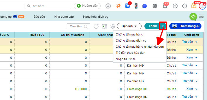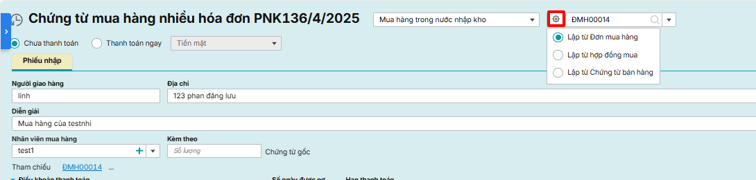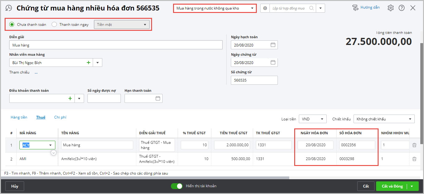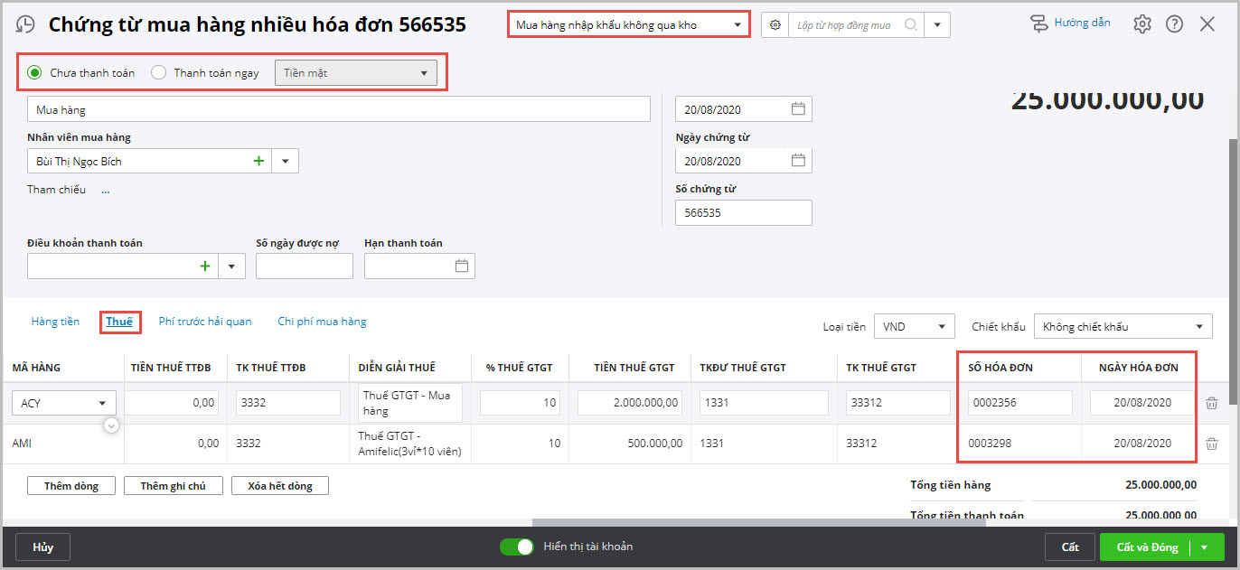 Lập chứng từ mua hàng nhiều hóa đơn