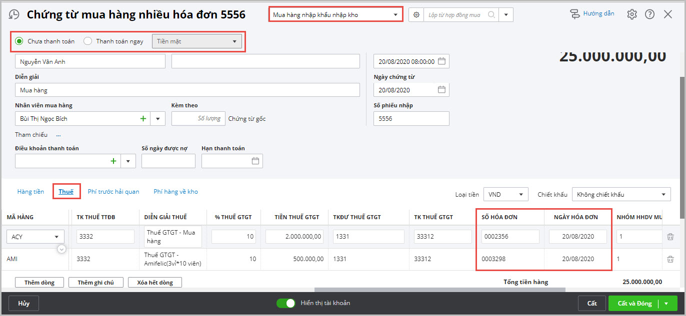 6. Lập chứng từ mua hàng nhiều hóa đơn