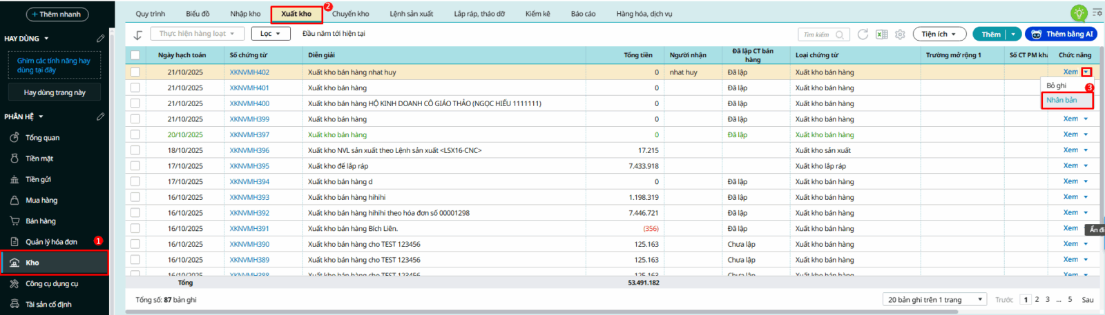Bước 1: Vào phân hệ Kho\Tab Xuất kho chọn phiếu xuất kho có nội dung tương tự với phiếu xuất kho cần lập trên danh sách phiếu nhập, xuất kho.