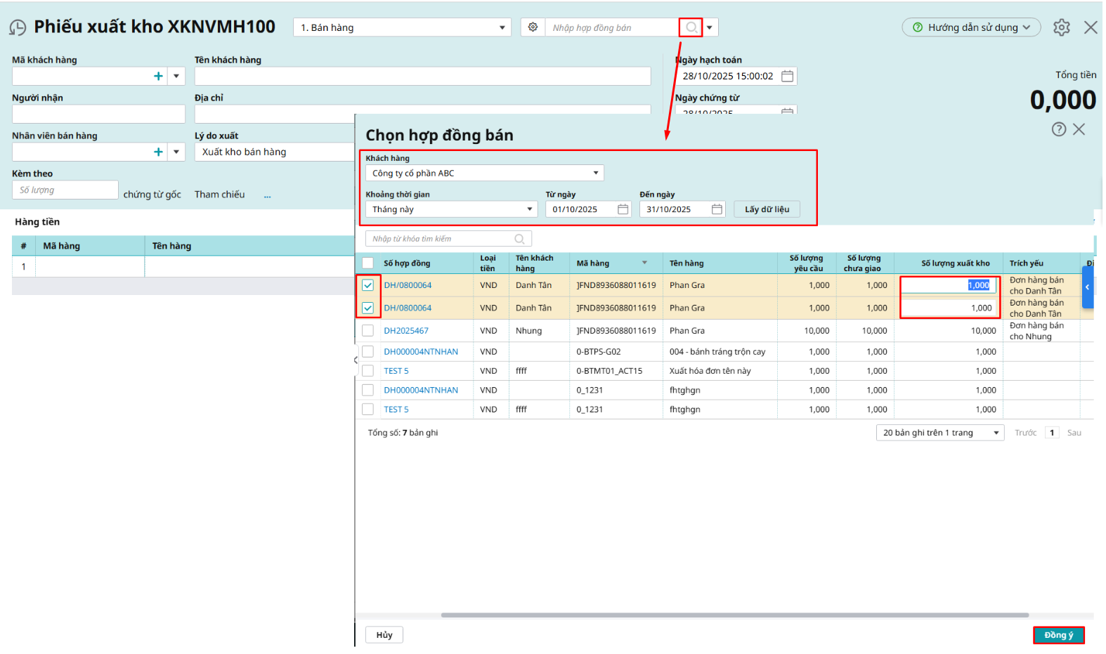 Bước 5: Tích chọn các mặt hàng được xuất và nhập số lượng được xuất, sau đó nhấn Đồng ý.