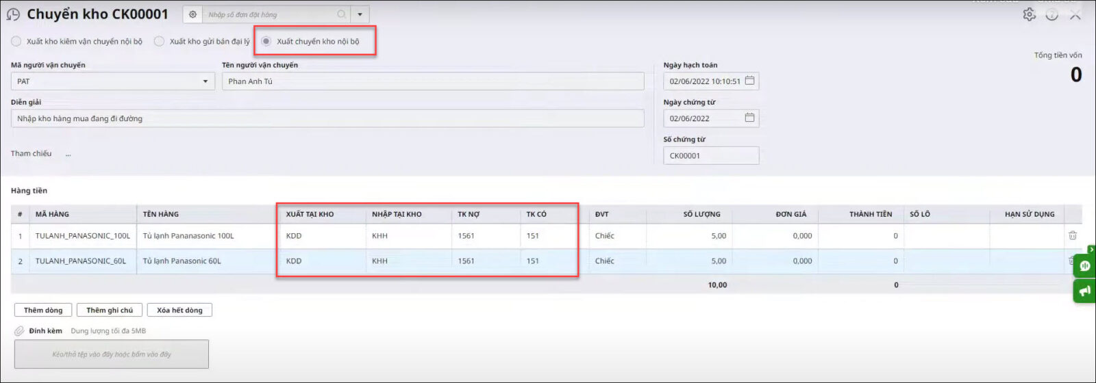 Lưu ý: Trường hợp Thủ kho có tham gia sử dụng phần mềm, sau khi phiếu chuyển kho được lập, chương trình sẽ tự động sinh ra chứng từ chuyển kho trên tab Đề nghị nhập, xuất kho của Thủ kho. Thủ kho sẽ thực hiện ghi sổ chứng từ chuyển kho vào sổ kho. |