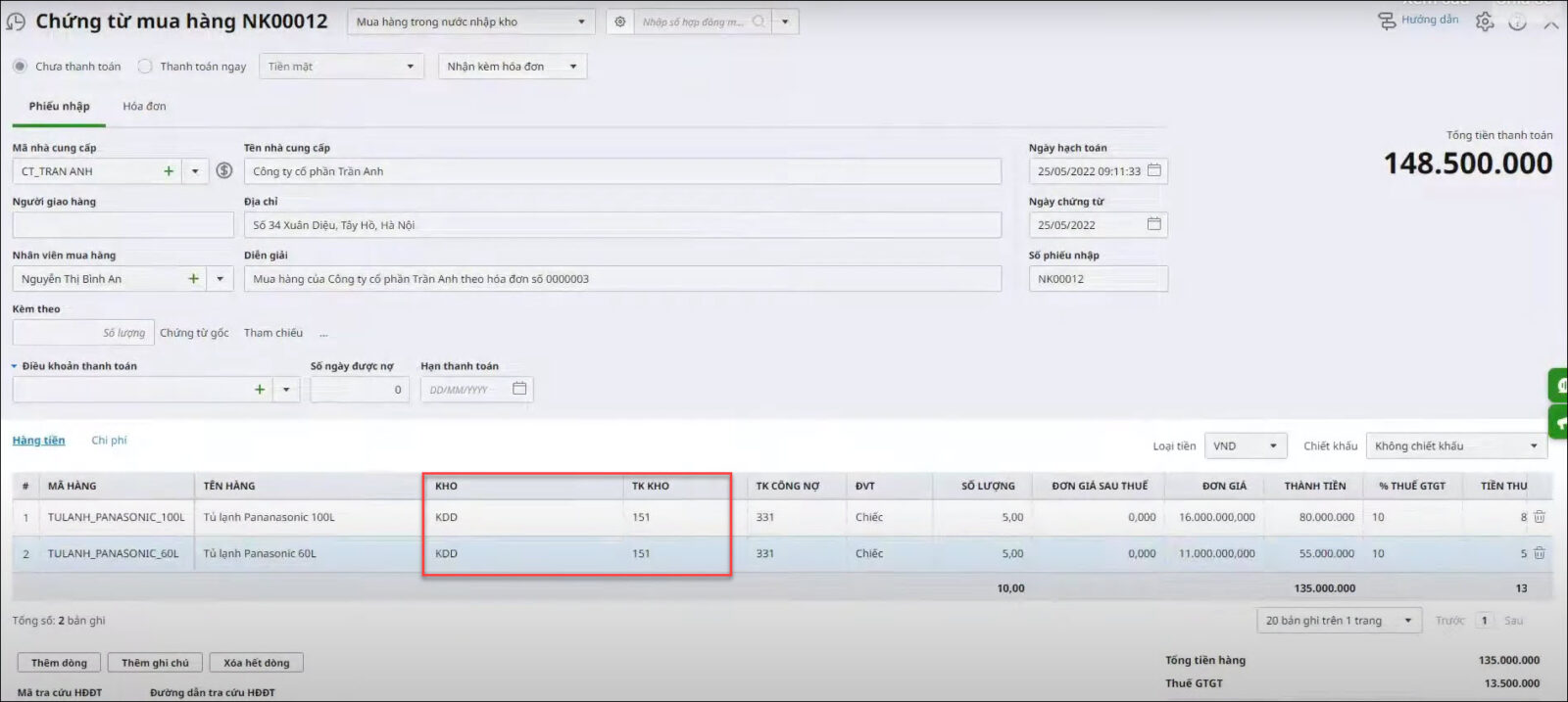 - Khi hàng về nhập kho (nhận được hàng, đủ điều kiện ghi tăng hàng tồn kho)