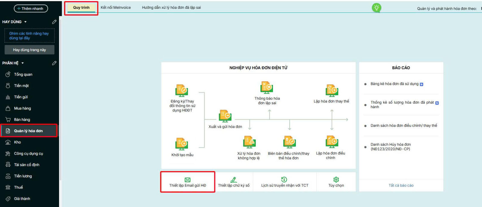Bước 1: Vào phân hệ Quản lý hóa đơn, chọn Tab Quy trình \ Thiết lập Email gửi hóa đơn